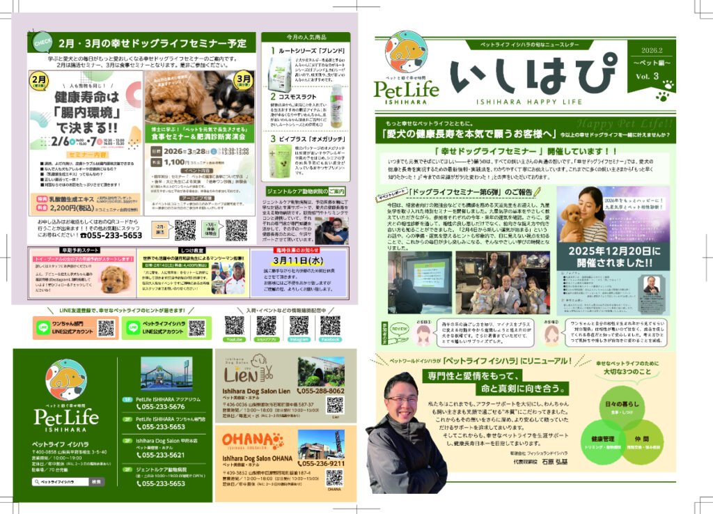 2026/2/9 ニュースレターvol.3 いつもペットライフイシハラをご利用いただき、誠にありがとうございます。「ペットライフイシハラ」として、お客様にもっと有益な情報をお伝えできるようニュースレターもリニューアルしました!ぜひご覧ください!