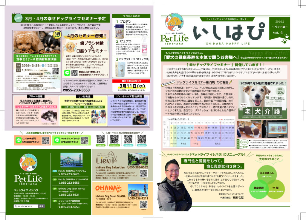 2026/3/12 ニュースレターvol.4 いつもペットライフイシハラをご利用いただき、誠にありがとうございます。「ペットライフイシハラ」として、お客様にもっと有益な情報をお伝えできるようニュースレターもリニューアルしました!ぜひご覧ください!